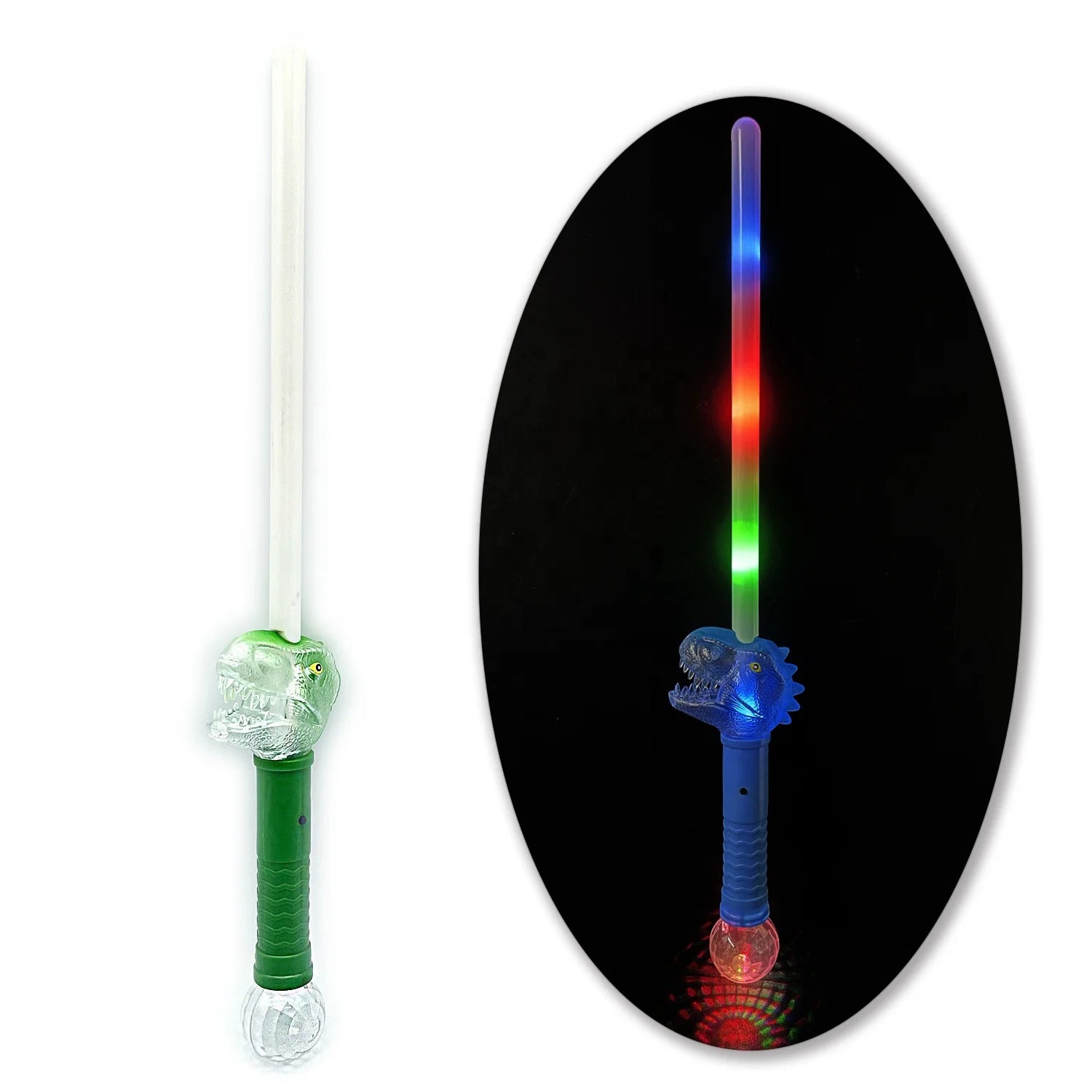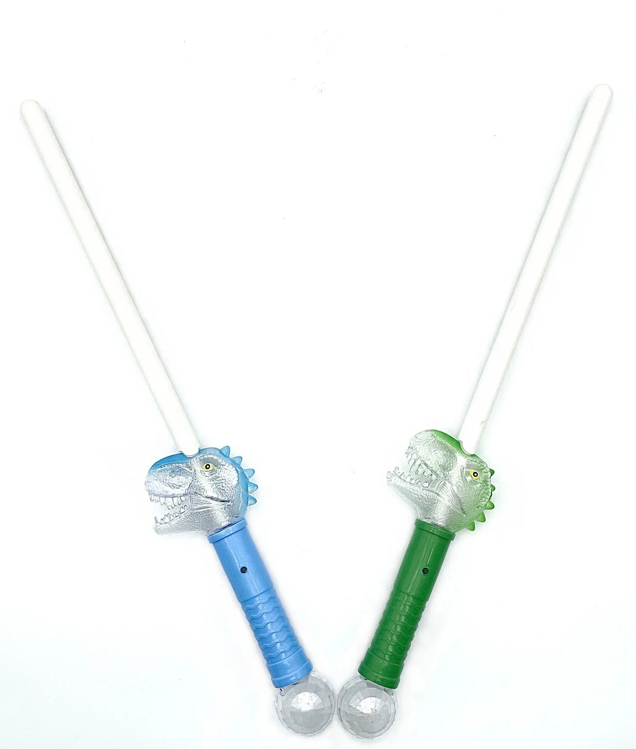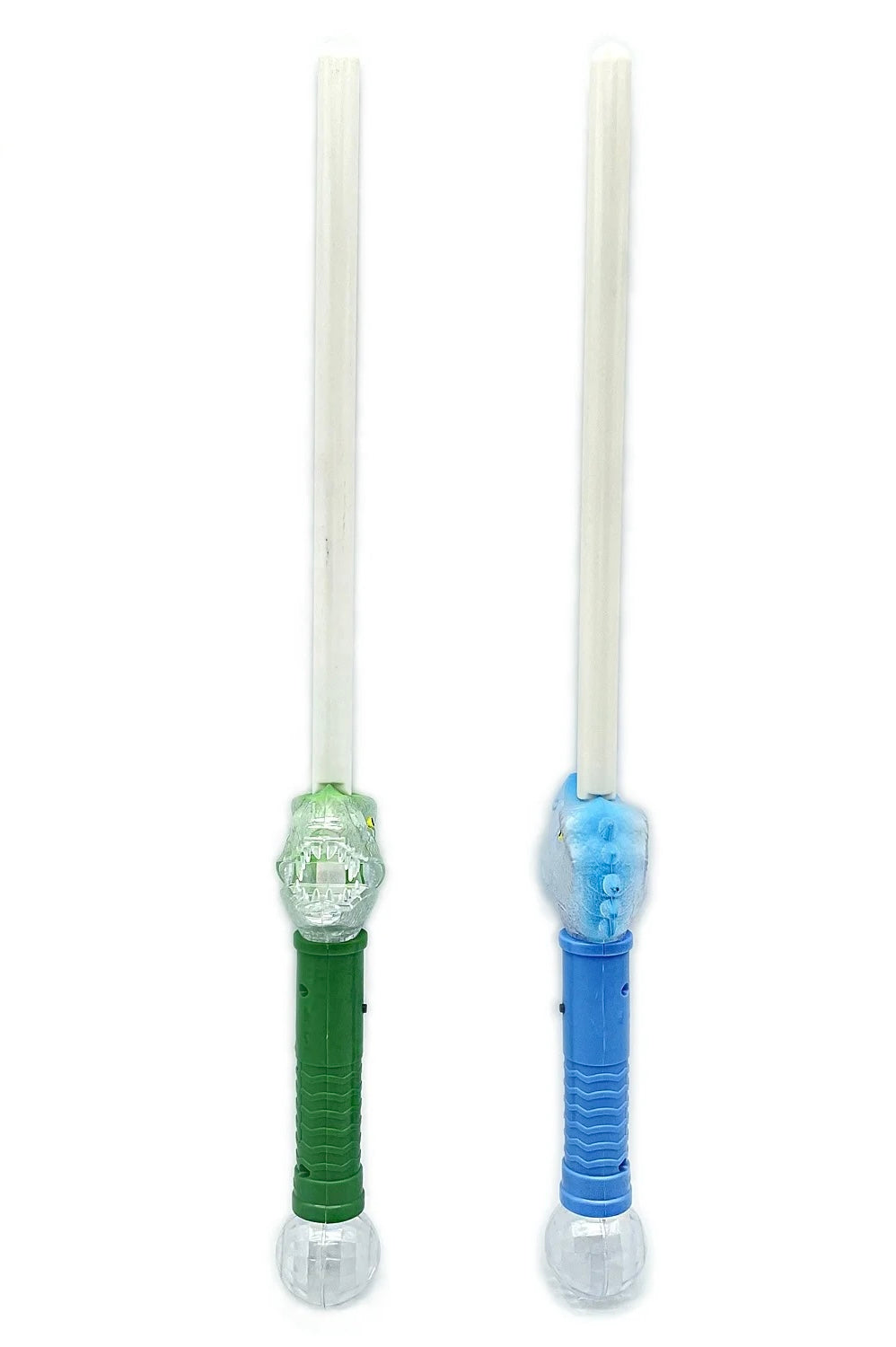 Multicolor lights will illuminate the Tyrannosaurus Rex's head, fiber optics, and crystal ball on the bottom of the handle for a roaring good time.